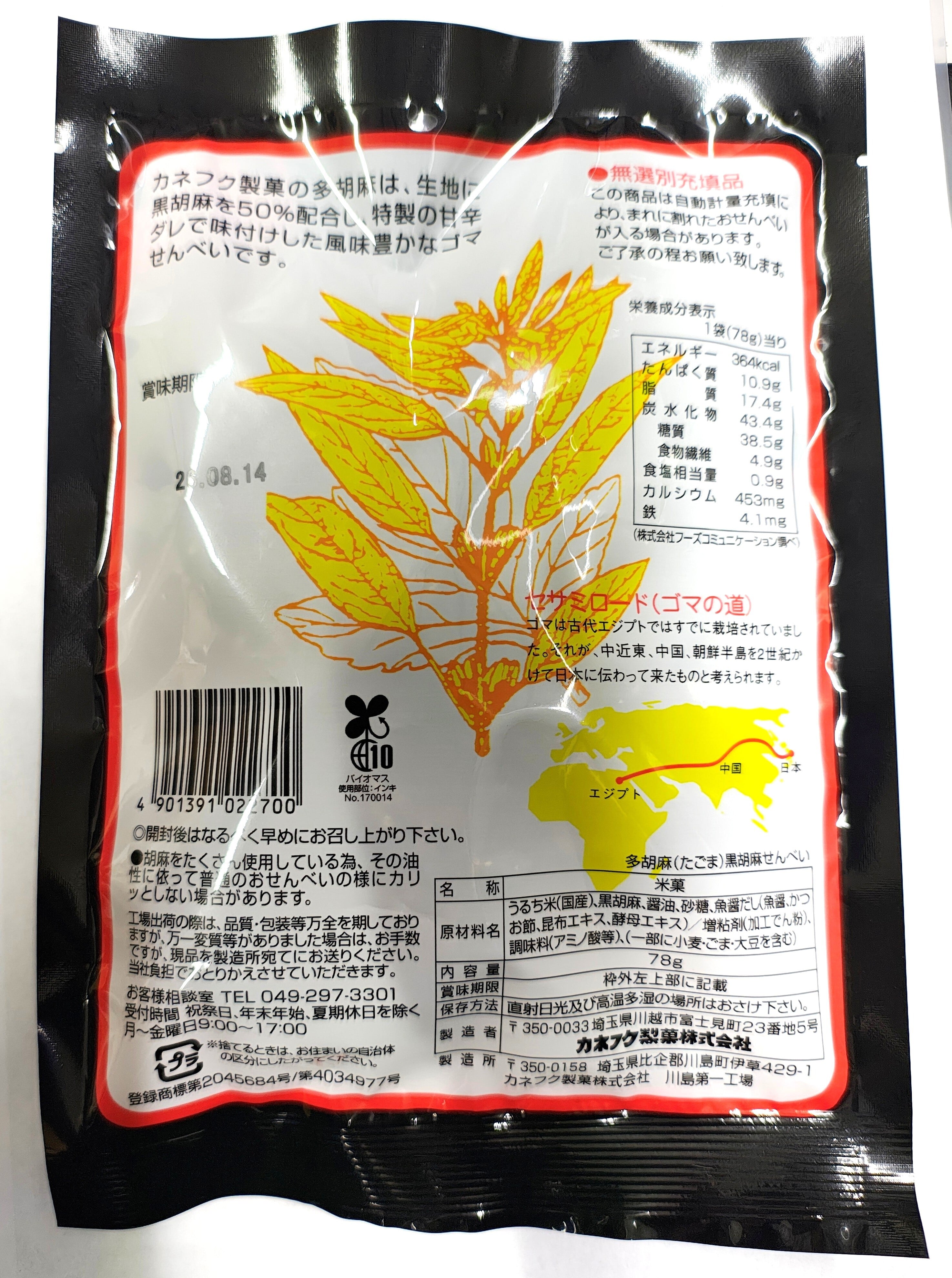 ◆うるち米(国産)、黒胡麻、醤油、砂糖、魚醤だし(魚醤、かつお節、昆布エキス、酵母エキス)/増粘剤(加工でん粉)、調味料(アミノ酸等)、(一部に小麦・ごま・大豆を含む)