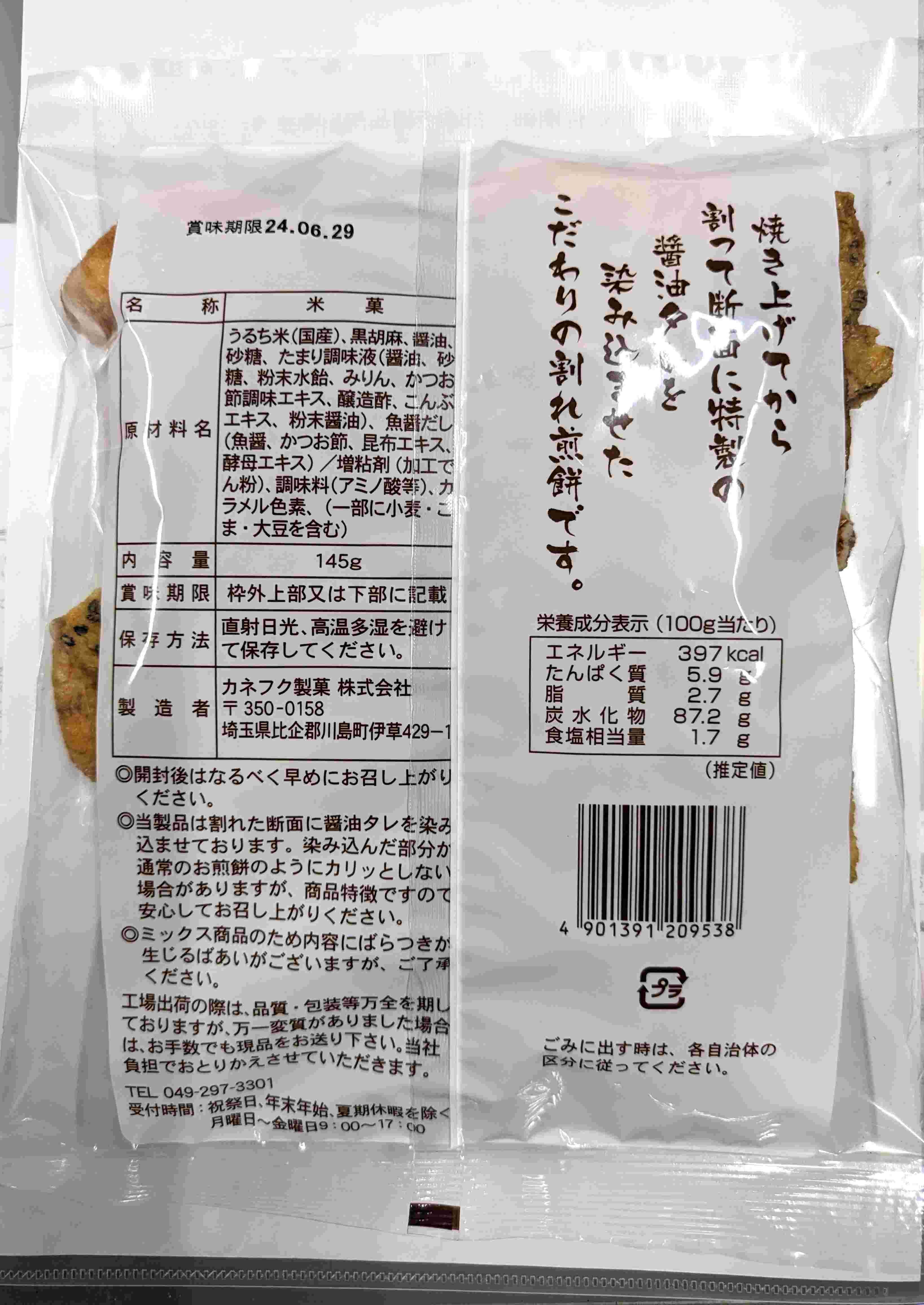 ◆うるち米(国産)、黒胡麻、醤油、砂糖、たまり調味液(醤油、砂糖、粉末水飴、みりん、かつお節調味エキス、醸造酢、昆布エキス、酵母エキス)/増粘剤(加工でん粉)、調味料(アミノ酸等)、カラメル色素(一部に小麦・ごま・大豆を含む)