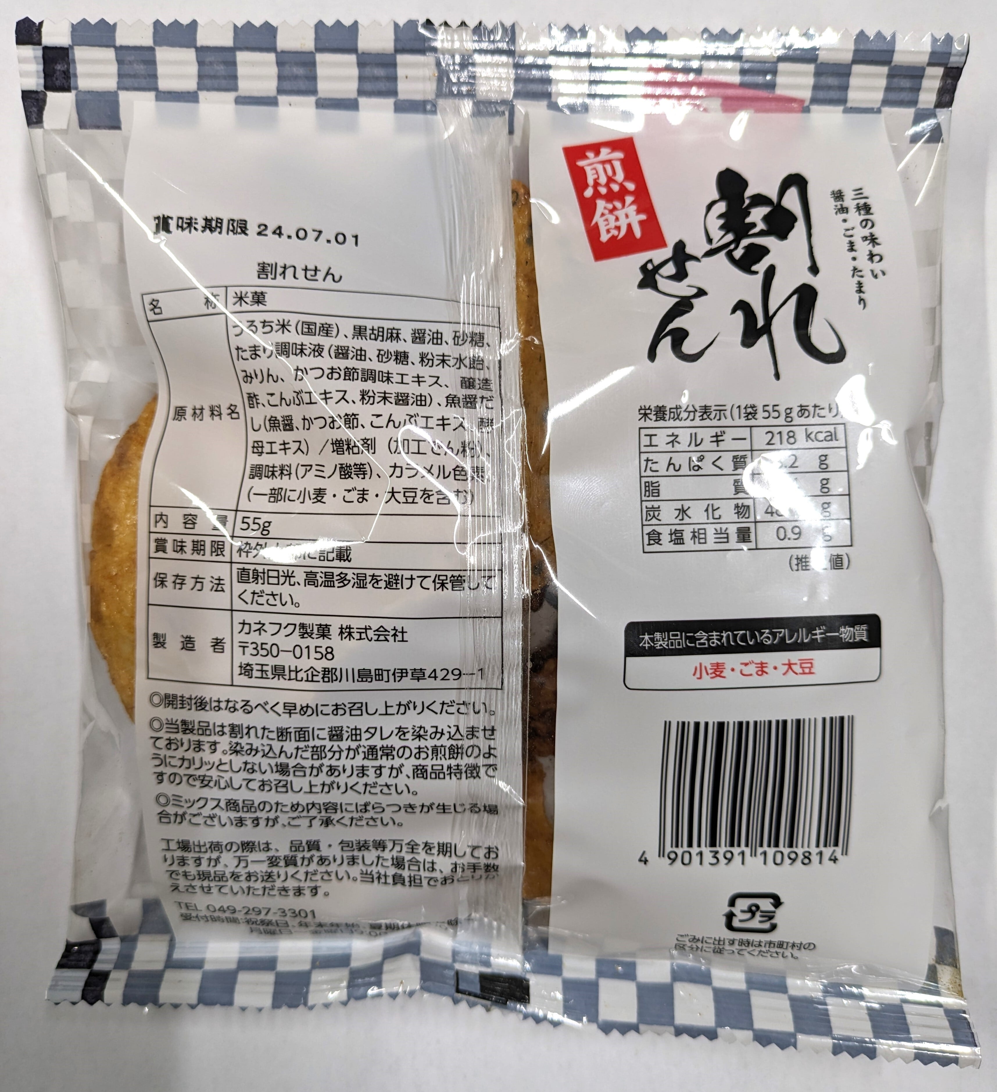 ◆うるち米(国産)、黒胡麻、醤油、砂糖、たまり調味液(醤油、砂糖、粉末水飴、みりん、かつお節調味エキス、醸造酢、昆布エキス、酵母エキス)/増粘剤(加工でん粉)、調味料(アミノ酸等)、カラメル色素(一部に小麦・ごま・大豆を含む)